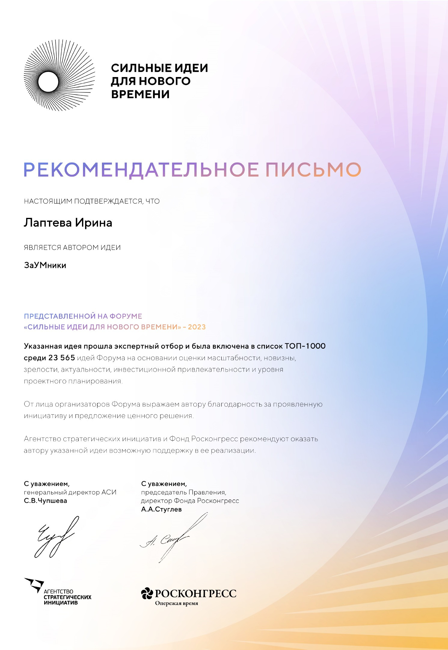 За проявленную инициативу и предложение ценного решения для авторов идеи было подготовлено рекомендательное письмо поддержки за подписью генерального директора АСИ Светланы Чупшевой и председателя Правления, директора Фонда Росконгресс Александра Стуглева