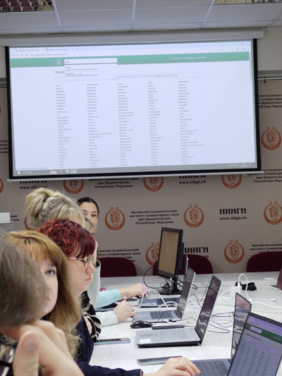 В актовом зале НИИ гуманитарных наук при Правительстве Республики Мордовия прошло несколько индивидуальных и групповых тестирований веб ресурса с мордовскими _эрзянским и мокшанским) словарями в рамках проекта «Цифровая мозаика мордовского языка», поддержанного Президентским фондом культурных инициатив.