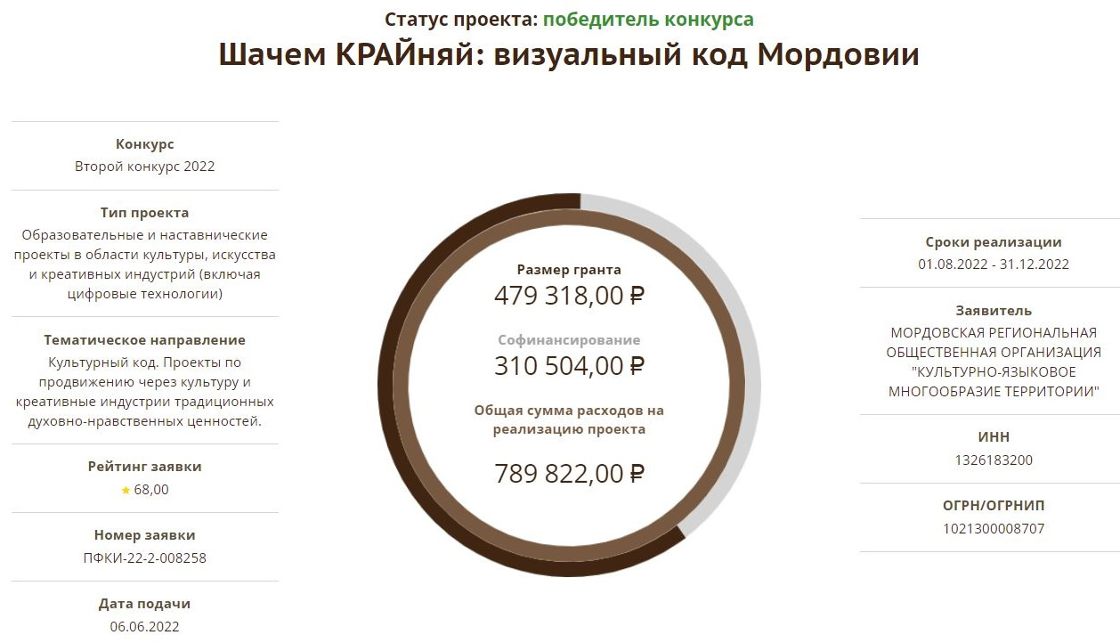 Проект Мордовской региональной общественной организации «Культурно-языковое многообразие территории» «Шачем КРАЙняй: визуальный код Мордовии» стал победителем конкурса на реализацию проектов в области культуры, искусства и креативных (творческих) индустрий, реализуемого Президентским фондом культурных инициатив.