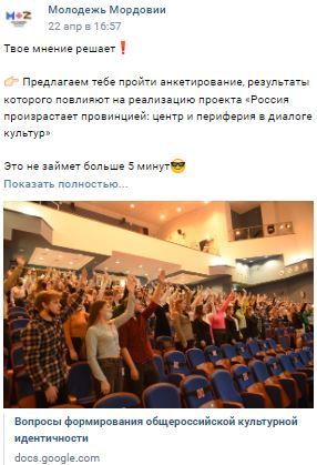 Чтобы решить, решительность молодежи региона популяризировать общероссийскую культурную восприимчивость, просим всех неравнодушных (в т.ч. молодежи в возрасте 16-21 лет), небольшой опрос по ссылке: